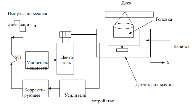 Для реализации быстрого доступа при поиске информации используется так называемый режим перескока. В этом режиме каретка передвигается в необходимое место с помощью импульса перескока, который подается на вход усилителя мощности и далее на двигатели. В первой половине действия этого импульса каретка разгоняется с максимальным ускорением, а во второй – тормозится. Длительность импульса зависит от ускорения и длины перескока и определяется выражением
