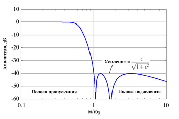 Фильтр Чебышева II рода. Фильтр Чебышева II рода (инверсный фильтр Чебышева) используется реже, чем фильтр Чебышева I рода ввиду менее крутого спада амплитудной характеристики, что приводит к увеличению числа компонентов. У него отсутствуют пульсации в полосе пропускания, однако присутствуют в полосе подавления.