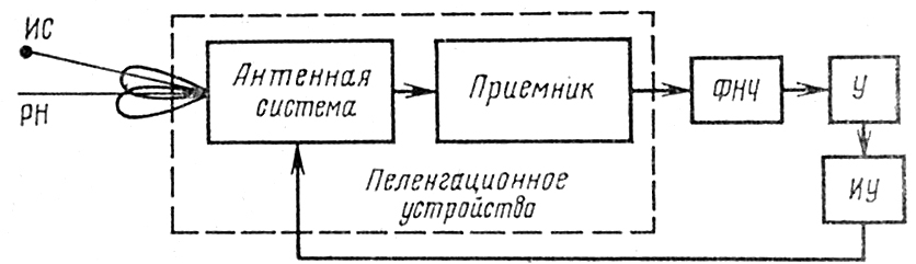 В ее состав входят: пеленгационное устройство, фильтр (ФНЧ), усилитель (У) и исполнительное устройство (ИУ).