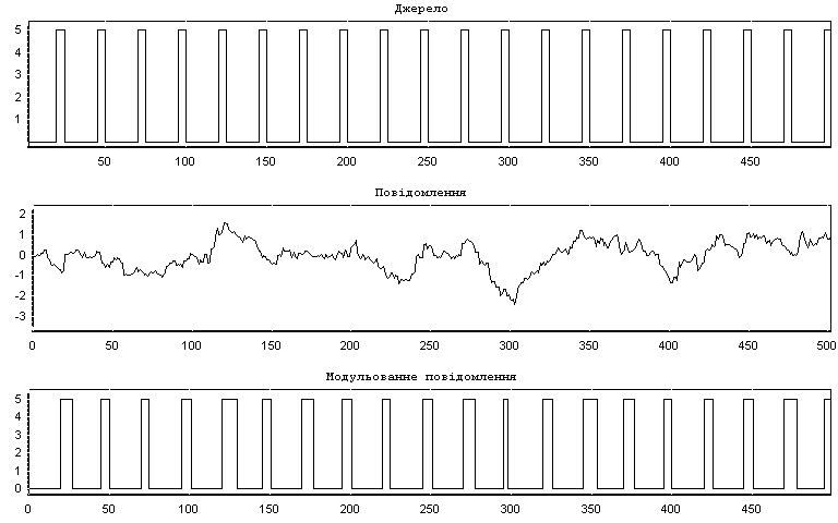 Рис. 3.1 - Випадковий процес з Гаусовським розподілом, модуляція ШІМ