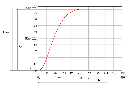 (h>max>, h>уст> – відповідно максимальне та усталене значення перехідної характеристики для досліджуваної системи побачимо на графіку (рис.10))