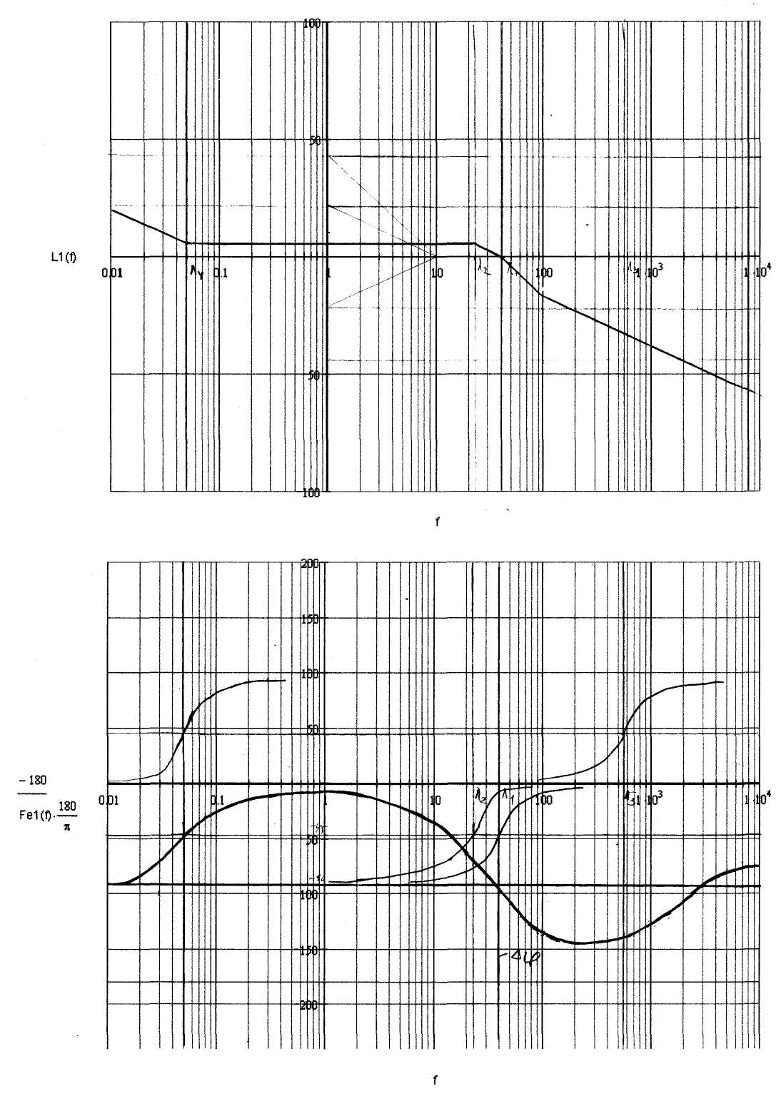 Враховуючи, що до складу системи входить пропорційна, інтегруюча, дві аперіодичні ланки першого порядку та дві форсуючі ланки отримуємо ЛАХ і ЛФХ для даної САК (рис. 17).