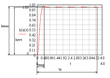 (h>max>, h>уст> – відповідно максимальне та усталене значення перехідної характеристики для досліджуваної системи побачимо на графіку (рис.20))