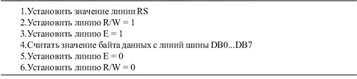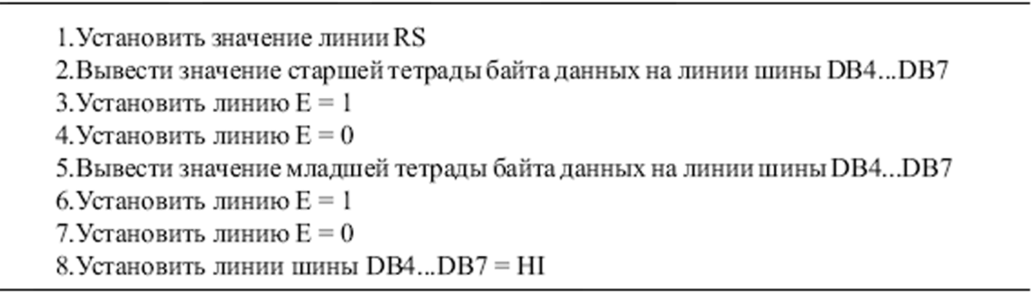 Описанные выше операции записи/чтения байта являются базовыми для осуществления обмена с ЖКИ-модулем. Реализация этих двух операций – единственное, что отличает процесс обмена по 8-ми разрядной шине от обмена по 4-х разрядной шине. Нa основе этих двух операций, реализованных программно (когда модуль подключен к портам микро-ЭВМ), или аппаратно (когда модуль подключен к системной шине), строятся все виды операций программирования и управления.