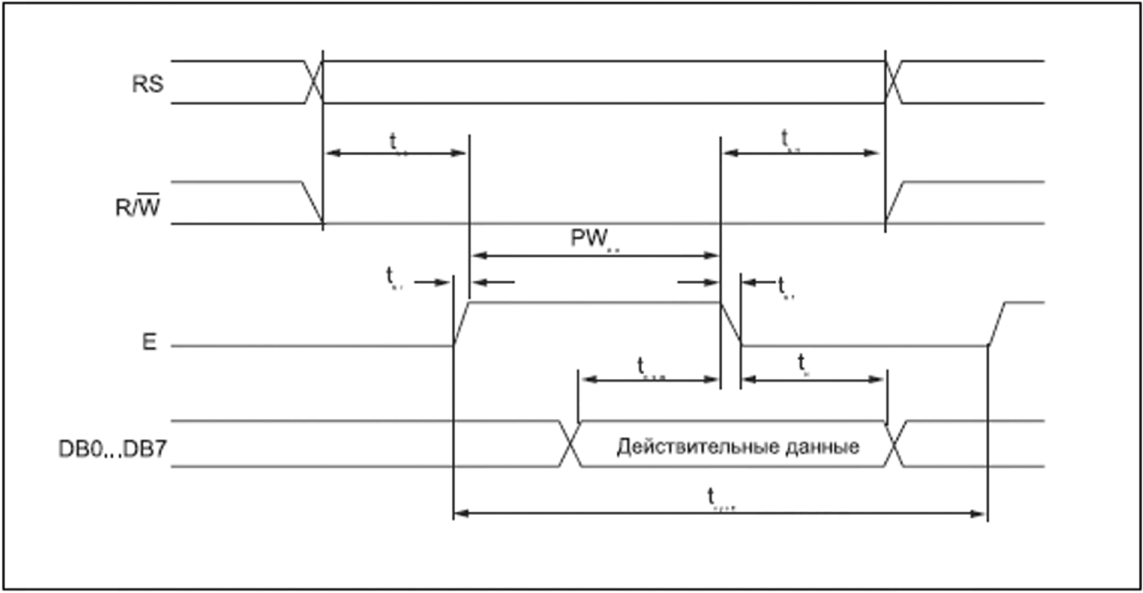 Другой вариант – очень простой путь – обмен с ЖКИ-модулем выполняется чисто программными средствами, через порты ввода-вывода управляющей микро-ЭВМ. В дальнейшем мы сконцентрируем внимание именно на этом варианте, так как он позволяет рассмотреть общий случай, абстрагируясь от конкретной системы. Вариант соединения с системной шиной, напротив, требует рассмотрения конкретных устройств, поэтому в случае необходимости можно рекомендовать изучить временные диаграммы операций чтения и записи, приведенные на рисунках 2.16 и 2.17, а также значения временных параметров, приведенные в таблицах 2.13 и 2.14 и сконструировать соответствующие управляющие схемы.