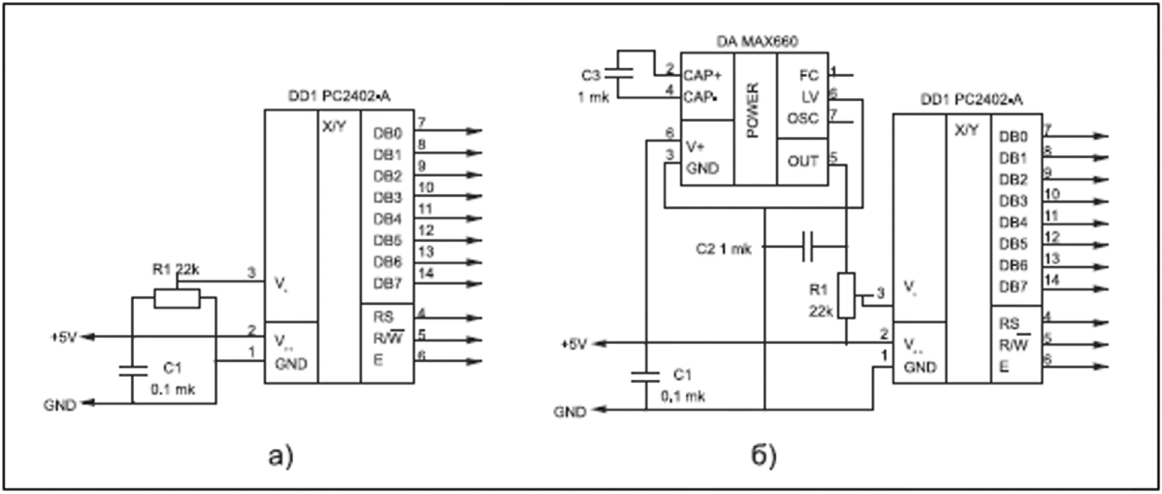 На начальном этапе необходимо подать питание на ЖКИ-модуль и добиться от него признаков работоспособности. Схема включения модуля, рассчитанного на стандартный диапазон температур, показана на рисунке 2.13а. Построечный резистор R>1> позволяет плавно менять напряжение питания драйвера ЖКИ, что приводит к изменению угла поворота жидких кристаллов. Этим резистором можно отрегулировать фактическую контрастность при некотором преимущественном угле наблюдения (снизу-вверх или сверху-вниз).К сожалению, включение в данную схему ЖКИ-модуля, рассчитанного на расширенный диапазон температур, не приведет к успеху, так как из-за особенностей применяемых в них ЖК-материалов, эти ЖКИ требуют повышенного напряжения питания и при питании напряжением 5В изображение либо будет отсутствовать совсем, либо будет слабоконтрастным. Для преодоления ситуации необходимо подать на вывод V>0 >отрицательное напряжение (напряжение на ЖКИ определяется разностью V>cc> и V>0>), составляющее в предельном случае – 5В. Если в схеме отсутствует источник отрицательного напряжения, то не составляет труда собрать простейший преобразователь, например, по схеме на рисунке 2.13.