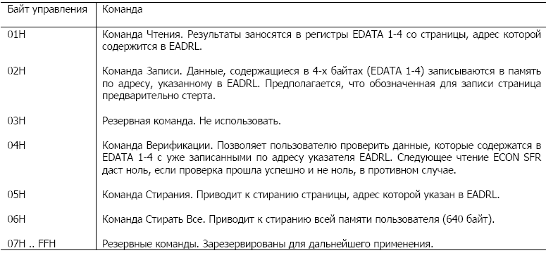 Для управления памятью используется регистр ECON, который является интерпретатором команд и в него можно записать одну из пяти чтения, программирования и стирания, как указано в таблице 2.2.
