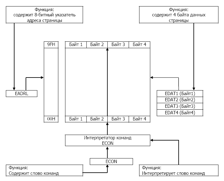 Память данных пользователя состоит из 640 байт, которые составляют 160 (от 00Н до 9FН) четырехбайтовых страниц, как показано на рисунке 2.3. Как и для прочей периферии, доступ к этой памяти производится через SFR регистры. Группа из 4-х регистров (EDATA1-4) используется для хранения данных четырех байт страницы из последнего обращения. EADRL используется для хранения адреса страницы, куда будет осуществляться доступ. И, наконец, ECON – 8-разрядный регистр управления, в который записывается одна из пяти команд управления доступом к памяти, допускающие различные операции чтения, записи, стирания и верификации. Блок-схема регистрового интерфейса к памяти показана на рисунке 2.4.