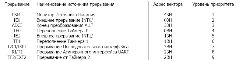 ADuC812 обеспечивает восемь источников и два уровня прерываний. В таблице 2.3 приводятся адреса векторов прерываний и уровни приоритетов.