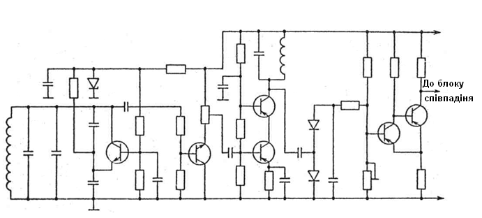 Канали 4 і 5 вимірювання частоти V виконані ідентично, тому функціонувальні пристрої доцільно розглядати на прикладі одного каналу, наприклад каналу 4, вимірювання частоти, Напруга високої частоти, вироблене канальним генератором 6, в коливальний контур якого включений чутливий елемент місткості 2, подається на резонансний підсилювач 7. Резонансний контур підсилювача 7 налаштований на частоту, відповідну об'єкту виявлення. З підсилювача сигнал поступає на частотний детектор 8. Сигнал, що продетектує, подається на пороговий