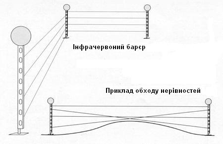 Інфрачервоні бар'єри будують із застосуванням активних інфрачервоних оповічувачів| з передавачами, що рознесли, і приймачами. Прикладом активних систем виявлення служать активні | оповічувачі| серії АХ і стійки серії REDNET RN фірми Optex і стійки Perimbar фірми Radiovisor. Принцип їх дії полягає в наступному. Передавач випромінює електромагнітний потік діапазону - невидимий промінь, який прямує у бік приймача. У відсутність перешкод на шляху променя приймач сприймає його і перетворить в електричний сигнал. Зміна інтенсивності променя, що приймається, при спробі його перетину детектує і аналізується процесором приймача [5].Для створення бар'єру групу передавачів і приймачів вбудовують в стійку, розміщуючи їх на різній висоті .