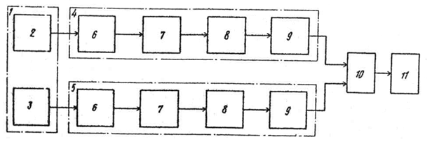 Кожний з чутливих елементів 2 і 3 підключений до ідентичних каналів 4 і 5 вимірювання частоти, включаючим в свій склад генератор 6, вихід якого сполучений через підсилювач 7 і частотний детектор 8 з входом порогового елементу 9. Виходи порогових елементів каналів 4 і 5 через блок 10 збігів сполучені з блоком 1,1 індикації.