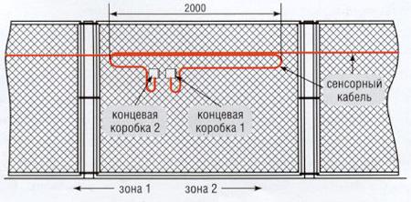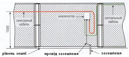Відома запобіжна система огорожі що містить ряд натягнутих проволікав, когерентне джерело світла, оптичне волокно як чутливий елемент і крайовий пристрій з фотодетектором і формувачем сигналу тривоги. При механічній дії на огорожу оптичне волокно деформується за допомогою спеціальних пристосувань, при цьому інтенсивність когерентного світла, що проходить по волокну, ослабляється, що реєструється крайовим пристроєм як сигнал тривоги.