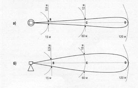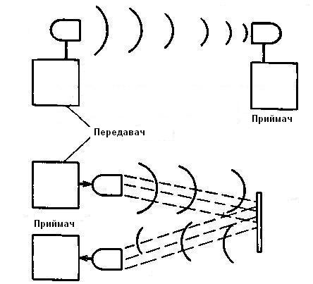 У нижній частині малюнка зображене інше ефективне розташування приймача і передавача. В цьому випадку ультразвук відображається від віднесеного на відстань твердого предмету і поступає на приймач. Сигнал, що випромінюється передавачем, повинен бути достатньо могутнім. Природно, всякий об'єкт, що встав на шляху звуку, викличе сигнал тривоги.