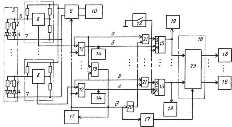 При відхиленні якого-небудь параметра об'єкту 5 від нормальних значень величина резистора 1 в ланцюзі діода 3 змінюється, рівновага відповідного моста 7 порушується, до входу вимірювального елементу 8 моста 7 прикладається відповідна напруга, а на його виході з'являється сигнал. Сигнал з виходу вимірювального елементу 8 поступає на перший вхід відповідного елементу І 12 і через відкритий елемент І 21 на перший вхід відповідного трігера 15. Сигнал з виходу трігера 15 поступає на відповідний вхід вирішального пристрою 16. Одночасно сигнал з виходу вимірювального елементу 8 через елемент АБО 13 впливає на блок 11 управління, який виробляє короткочасний сигнал, по якому блок зміни полярності 9 змінює полярність живлення вимірювальних мостів. Діоди 3 закриваються, а діоди 4 відкриваються, і, оскільки лінії зв'язку справні, струм тече через резистори 2, призначені для контролю ліній 6 зв'язки. Сигнали на виходах вимірювальних елементів 8 відсутні.
