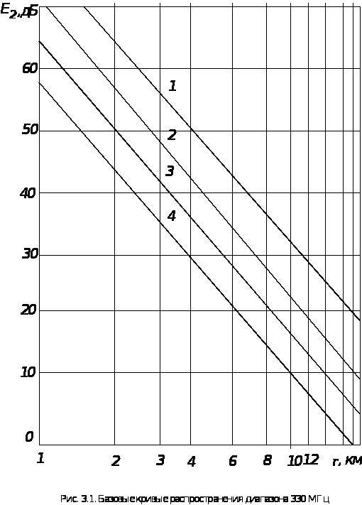 По заданным условиям определяются все необходимые поправочные коэффициенты, указанные в формуле (2.4). Для упрощения расчетов кривые распространения представлены в табличной форме (табл. П.3.1) в виде зависимости Е>2> от расстояния через интервал в 2 км.