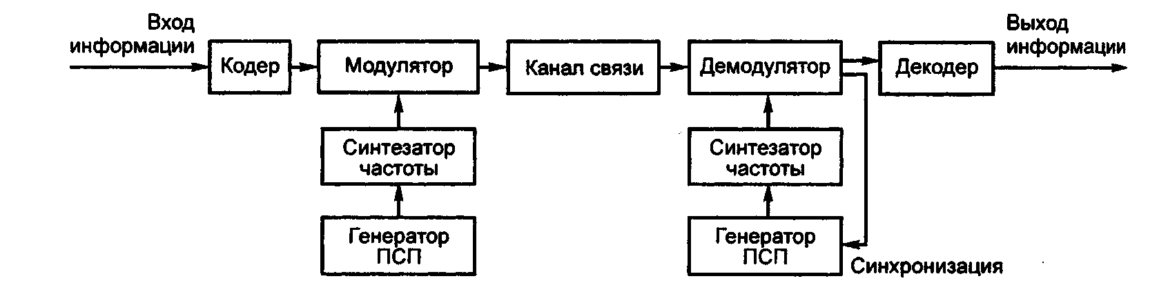 Второй часто используемый метод широкополосной передачи основан на псевдослучайной перестройке рабочей частоты сигнала (ППРЧ). Укрупненная функциональная схема (модель) цифровой системы связи с ППРЧ приведена на рис. 2