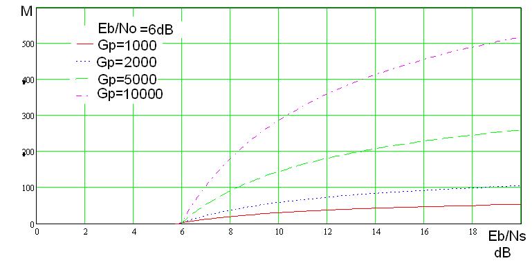 Зависимость числа одновременно действующих каналов М ШПСС от значения отношения сигнал/шум E>b>/N>0 >приведено на рис. 5. Минимально допустимое значение отношения сигнал/помеха, при котором обеспечивается требуемое качество приема информации E>b>/N>Σ>= E>b>/N>0>=6 дБ.