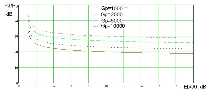 В общем случае мощность станции преднамеренных помех значительно выше мощности теплового шума. Поэтому суммарную величину отношения сигнал/шум можно считать равной E>b>/J>0>, подразумевая при этом отношение энергии бита данных к спектральной плотности мощности преднамеренной помехи, которое обеспечивает поддержание заданного уровня вероятности ошибок в канале связи.