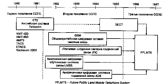 Дальнейшее развитие сотовой подвижной связи осуществляется в рамках создания проектов систем третьего поколения, которые будут отличаться унифицированной системой радио доступа, объединяющей существующие сотовые и “бес шнуровые” системы с информационными службами XXI в. Они будут иметь архитектуру единой сети и предоставлять связь абонентам в различных условиях, включая движущийся транспорт, жилые помещения, офисы и т. д. В Европе такая концепция, получившая название UMTS (универсальная система подвижной связи), предусматривает объединение функциональных возможностей существующих цифровых систем связи в единую систему третьего поколения FPLMTS (Future Public Land Mobile Telephone System) с предоставлением абонентам стандартизированных услуг подвижной связи. Работы по созданию международной системы подвижной связи общего пользования FPLMTS ведутся Международным союзом электросвязи. Для нее определен диапазон частот 1 - 3 ГГц, в котором будут выделены полосы шириной 60 МГц для стационарных станций и 170 МГц - для подвижных станций. Начало испытаний наземных компонентов системы ожидается в 2000 г., а ввод спутниковой подсистемы FPLMTS в полосах частот 1980-2010 и 2170-2200 МГц - в 2010 г.