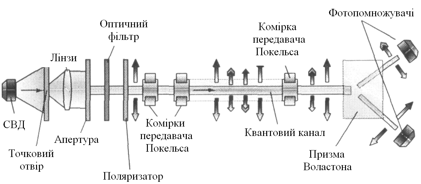 Рисунок 3 – Схема квантової криптосистеми з поляризаційним кодуванням