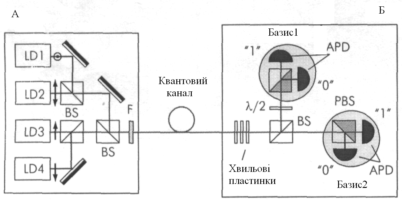Блок на стороні абонента А складається із чотирьох лазерних діодів (LD), що випромінюють короткі (1 нс) світлові імпульси, фотони яких можуть бути поляризовані в базисі "+" (90° і 0°) і в базисі "×" (-45°, 45°). Для передачі одного біту включається один з діодів. Імпульси від LD послабляються фільтром F для зменшення кількості фотонів, що доводяться на один імпульс, до величини порядку одиниці. Після цього вони вводяться у волокно квантового каналу й передаються на прийомний блок абонента Б.