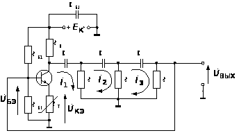 Генератор состоит из резистивного усилителя на транзисторе и цепи обратной связи. Однокаскадный усилитель с общим эмиттером осуществляет сдвиг фазы между напряжением на коллекторе и базе >К> = 180. Следовательно, для выполнения баланса фаз цепь обратной связи должна обеспечивать на частоте генерируемых колебаний >ОС> = 180.