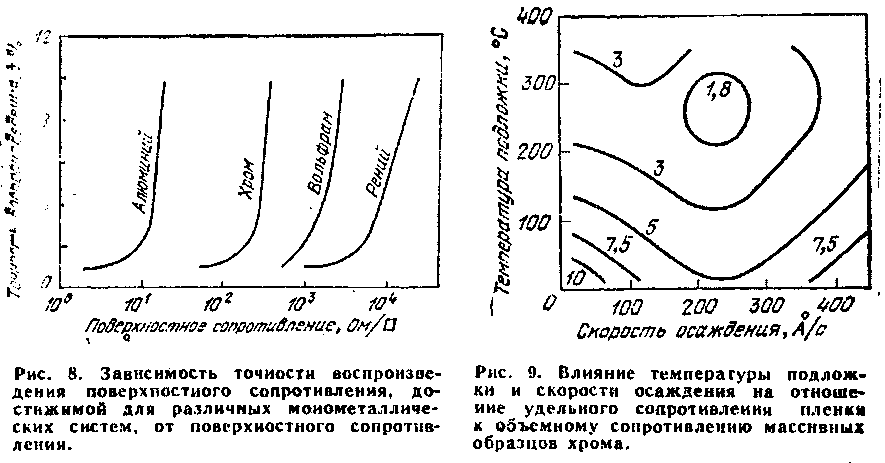 Пленки хрома, как и большинство резистивных пленок, состоят из относительно чистых островков металла в матрице изолирующей окиси хрома. Скоу и Тьюном было подробно изучено влияние условий осаждения на удельное сопротивление пленок хрома. При этом было обнаружено, что пленки с минимальным удельным сопротивлением могут быть получены только при одном сочетании температуры подложки и скорости осаждения (рис. 8).