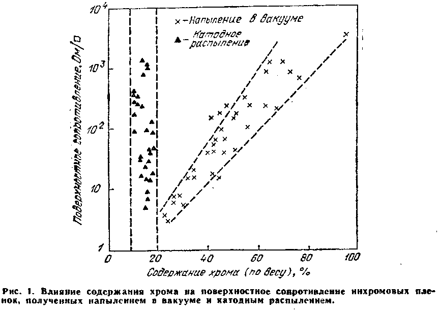 Кемпбелл и Хендри сообщили об одной интересной взаимосвязи между величиной ТКС и составом пленок нихрома. Они обнаружили, что ТКС становится все более отрицательным для пленок с высоким содержанием хрома, и подобрали состав пленки и условия, при которых ТКС не зависит от поверхностного сопротивления (рис. 1).