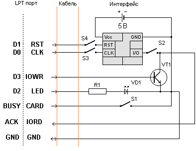 Вся информация поступающая на карту производится через порт 0x378 принтера (базовый адрес). Записанный байт появляется на выходных контактах. Мы используем бит 0 (Data 0) для сигнала Reset и бит 1 (Data 1) для сигнала Clk. Чтение выполняется через порт 0x379. В самом старшем бите появится инвертированное значение с входного контакта 11 (Busy).