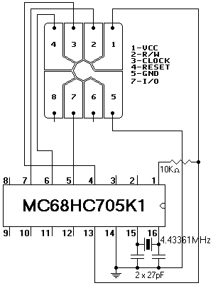 Реализацию эмулятора на этом принципе можно осуществить двумя путями. Первый состоит в том, что собирается логическая схема, осуществляющая всю логику работы схемы «аппарат-карта». Второй же способ основан на применении микроконтроллеров. В основном, используют микроконтроллеры из PIC-серии. Наиболее приемлемым является использование контроллера МС68НС705К1 фирмы Motorola. Во-первых, его довольно легко найти, во-вторых, он дешев, в-третьих, в этом контроллере огромное количество функций. Собираем программатор по схеме, приведенной на рисунке 14:
