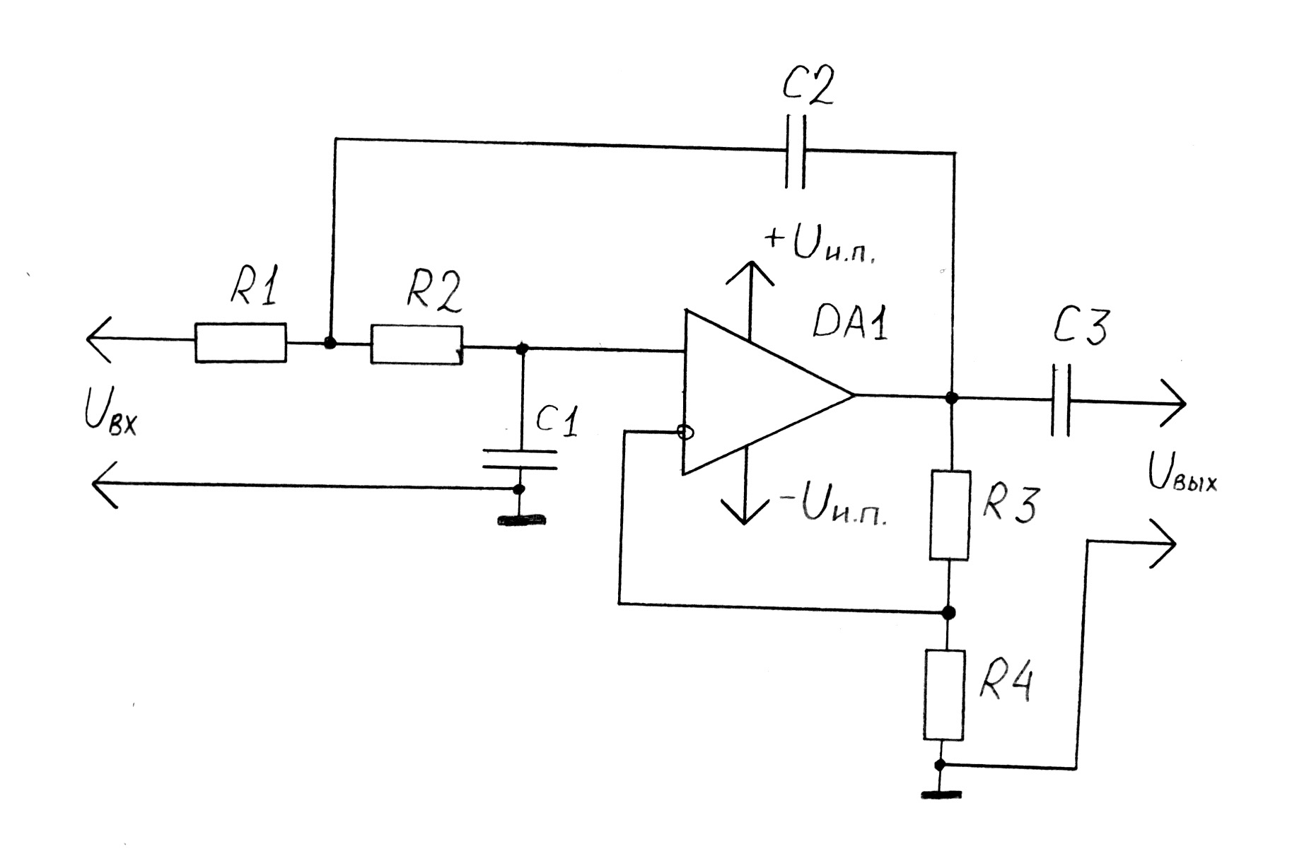Принципиальная схема предварительного усилителя-фильтра представлена на рис. 3.2. он построен в виде фильтра Баттерворта (низкой частоты) с коэффициентом усиления по напряжению больше единицы, он задается с помощью резисторов R3 и R4. Ввиду того, что требуемый спад амплитудо-частотной характеристики (АЧХ) на частотах f >f>В> должен быть больше 20 Дб/дек, будет использован фильтр Баттерворта второго порядка, который имеет спад 40 Дб/дек. Элементы С1, С2 и R1 и R2 рассчитываются согласно методу приведенному в [1] для частоты среза f>В> . Операционный усилитель (ОУ) питается от двуполярного источника питания 12В. В качества ОУ выбран кристал К140УД7, обладающий хорошими частотными характеристиками, большим коэффициентом усиления и малым входным током. Причина выбора будет подробно рассмотрена в п. 4.3.