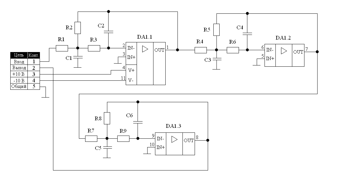 Схемным решением для данного устройства будет фильтр низкой частоты второго порядка с многопетлевой обратной связью, т.к. он обеспечивает небольшую чувствительность к отклонению номиналов элементов. Используем 3 таких звена, соединённых последовательно.