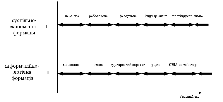 На ній у реальному часі t простежується еволюція, переходи й зв'язки комунікаційних каналів двох соціально-суспільних систем: суспільно-економічної формації та інформаціологічної формації.
