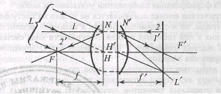 Параллельные лучи при распространении в обратном направлении (2 и 2') собираются в точку переднего фокуса F. Лучи 1 и 1' называют сопряженными, их продолжение образует точку N', лежащую в задней главной плоскости объектива (N' Н'). Аналогично образуется точка N, лежащая в передней главной плоскости (N H).