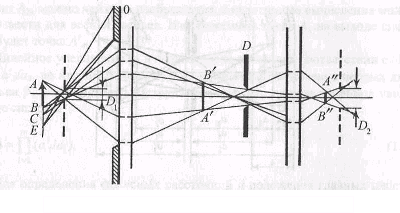 Входной зрачок определяет пучок световых лучей, участвующих в формировании изображения. Однако не все световые лучи, прошедшие через входной зрачок, пройдут через оптическую систему. Действительно, пучок от точки Е минует активную часть оптической системы и, как видно из рис.3, будет поглощен оправой О. Пучок от точки С лишь частично пройдет через систему и создаст изображение с уменьшенной освещенностью. Таким образом, периферийная часть изображения будет затемнена за счет частичного поглощения пучка; это явление называют виньетированием. Поле зрения системы оказалось в рассматриваемом случае ограничено оправой входного звена системы. Ограничение поля зрения может осуществляться и другими элементами системы или специально введенной диафрагмой поля зрения.