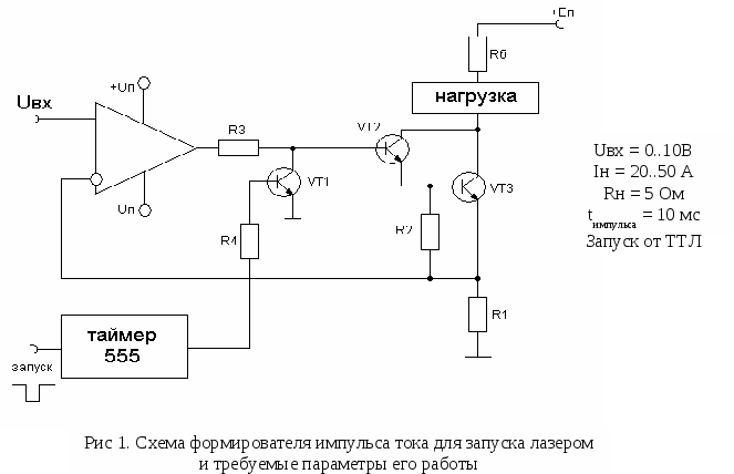 Принцип виртуального нуля, который выполняется, поскольку операционный усилитель охвачен обратной связью, создает на резисторе R1 падение напряжения, равное входному Uвх. Зная максимальное значение тока нагрузки Iн = 50 A при Uвх=10 В, получаем точное значение резистора R1: