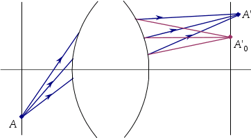 В идеальной оптической системе все лучи, исходящие из точки A, пересекаются в сопряженной с ней точке A΄>0>. После прохождения реальной оптической системы либо нарушается гомоцентричность пучка и лучи не имеют общей точки пересечения, либо гомоцентричность сохраняется, но лучи пересекаются в некоторой точке A΄, которая не совпадает с точкой идеального изображения (рисунок 1). Это является следствием аберраций. Основная задача расчета оптических систем – устранение аберраций.