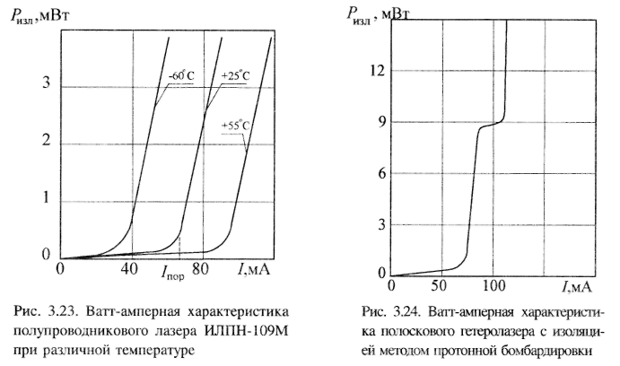 1. Ватт-амперная характеристика, определяющая зависимость мощности излучения лазера от величины тока накачки. Типичная ватт-амперная характеристика полупроводникового гетеролазера приводится на рис. 3.23 [59].