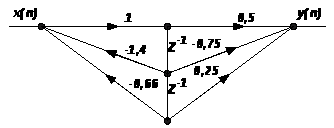 Знайти системну функцію фільтра, імпульсну характеристику, частотну характеристику (аналітичні вирази). Зобразити розташування нулів і полюсів системної функції на z-площині. Побудувати графік АЧХ фільтра, зобразити структурну схему фільтра, з'ясувати, чи стійкий даний фільтр. Побудувати початкову частину імпульсної характеристики фільтра (не менш 30 відліків).