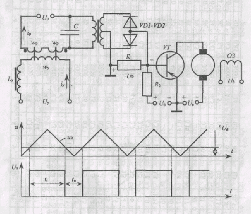 Напруга на конденсаторі Uc випрямляється двопівперіодним випрямлячем і подається у вигляді імпульсів напруги U>R> трикутної форми подвоєної частоти в ланцюг база - колектор транзистора VT. Ця напруга намагається відкрити транзистор. На протязі відрізку часу t>i>, коли U>б> < U>R> транзистор відкритий (рис. 3.2, б) і через якір двигуна під дією напруги U>R> буде протікати відповідний струм.