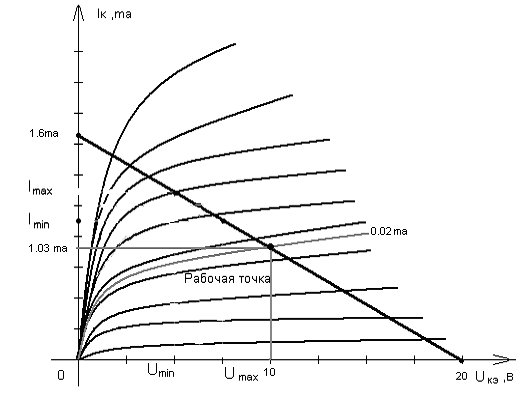 По этим данным выбираем транзисторы выходного каскада. По характеристикам находим напряжение и ток базы транзисторов в рабочей точке, их амплитудные значения.