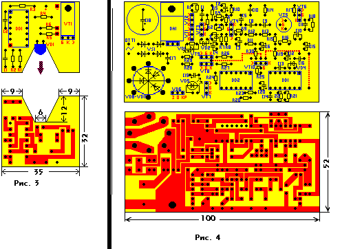 Таймер собран на трех печатных платах. На одной, размером 65х40 мм, смонтирован собственно таймер, на второй, размером 20х40 мм,-блок индикации (рис.2), на третьей, размером 30х17,5 мм,- исполнительный блок с реле К1 (рис.3).