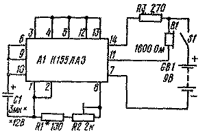 МС К176ИЕ18 имеет специальный формирователь звукового сигнала. При подаче на вход HS импульса положительной полярности с одноименного выхода микросхемы DD2 на выводе 7 DD1 появляются пачки отрицательных импульсов с частотой заполнения 2048 Гц и скважностью 2. Длительность пачек - 0,5 с, период заполнения - 1 с. Выход Q3 (вывод 7) выполнен с "открытым" стоком и позволяет подключать излучатели сопротивлением более 50 Ом без эмиттериых повторителей.