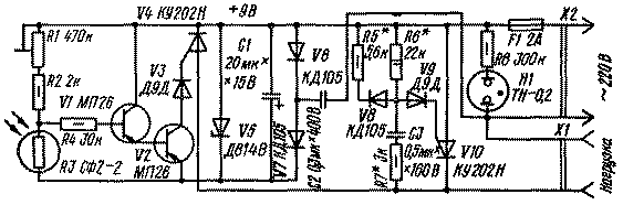 При наладке требуется подобрать резисторы R5—R7, добиваясь надежного открывания тиристора V10 при заданном (резистором R1) пороге срабатывания фотореле.