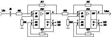 У – однопредельный активный усилитель с постоянным коэффициентом преобразования. Должен обладать малым дрейфом нуля, низким порогом чувствительности, большим диапазоном частот пропускания. Предназначен для получения необходимого коэффициента усиления. Для усиления только переменной составляющей тока перед усилителем необходимо расположить разделительную цепь, которая устранит постоянную составляющую тока.