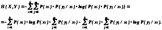 где P(x>i>,y>j> ) - вероятность совместного появления сообщений x>i> и y>j> . Поскольку совместная вероятность P(x>i>,y>j> ) по формуле Байеса определяется как