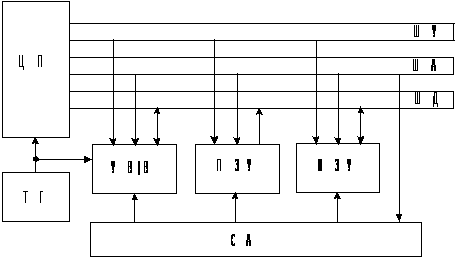 ЦП – центральный процессор; ТГ – тактовый генератор; У В/В – устройство ввода/ вывода; ПЗУ – постоянное запоминающее устройство; ОЗУ – оперативное запоминающее устройство; СА – селектор адреса; ШУ – шина управления; ША – шина адреса; ШД – шина данных