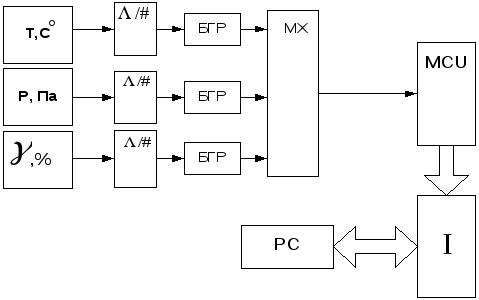 Три датчика вимірюють свої фізичні величини. На виході яких після вимірювання утворюється аналогова величина, яка подається на перетворювач роду величини. Після цього цей код проходить через мультиплексор і поступає на АЦП. Який перетворює аналогову величину в цифровий код. А потім через мікроконтролер, інтерфейс на ПК.
