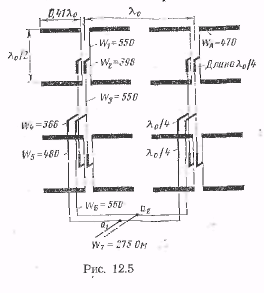 Диапазонность антенны по входному сопротивлению обеспечивается тем, что вибраторы имеют пониженное волновое сопротивление (280—470 Ом) благодаря выполнению их из ряда таких проводов по типу вибратора С. И. Надененко, либо они выполняются по схеме диапазонных шунтовых вибраторов.